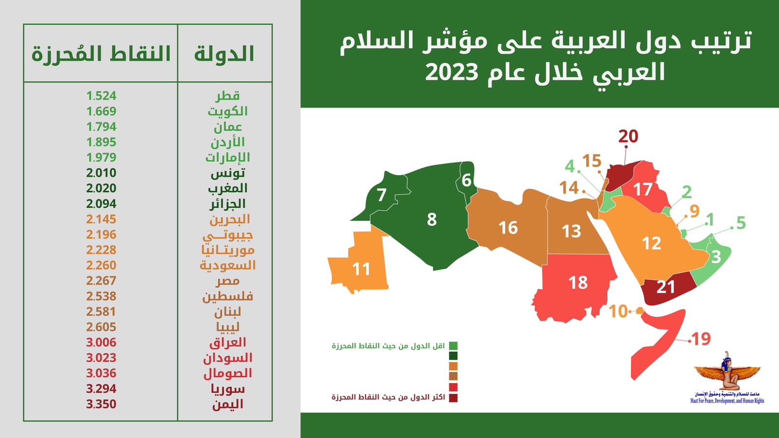 وقد أكدت مؤسسة ماعت أن مع إستمرار إطلاق النار في غزة، واستكمال العدوان الإسر+ائيلي جرائمه البشعة في كافة ارجاء فلسطين أثر هذا سلباً على كافة المسارات الرامية للسلام والعدالة بصورة تدفع لتدهور ترتيب فلسطين في مؤشر السلام العالمي لعام 2023 حيث جاءت في المرتبة 134 من أصل 163 دولة.