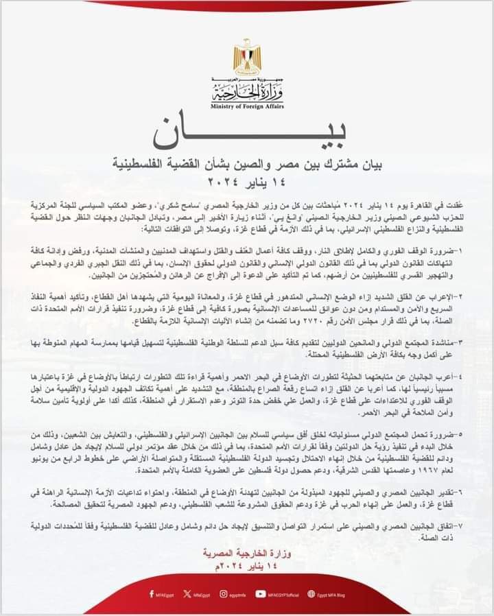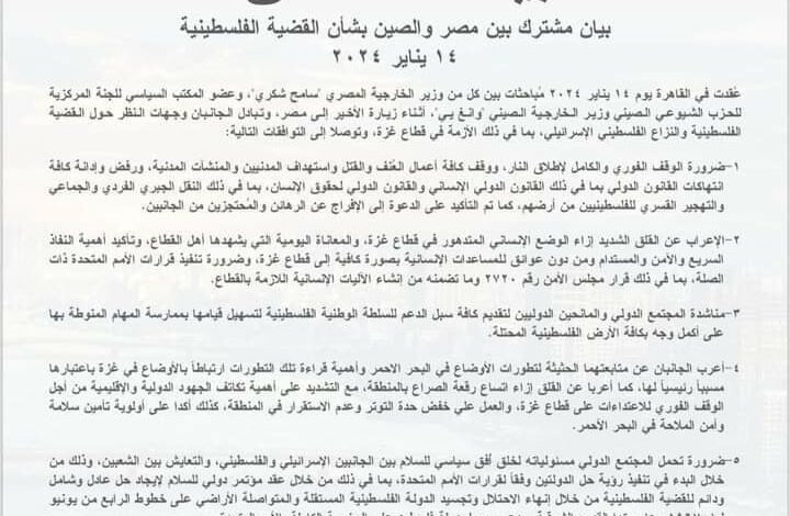 بيان مشترك بين مصر والصين بشأن القضية الفلسطينية