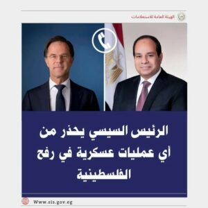 حذر الرئيس عبدالفتاح السيسي اليوم من أي عمليات عسكرية في رفح الفلسطينية، جاء ذلك خلال اتصال هاتفي تلقاه الرئيس السيسي اليوم من رئيس الوزراء الهولندي “مارك روته”، حيث جرى التطرق إلى العلاقات الثنائية بين البلدين، وسبل تعزيزها على مختلف المستويات السياسية والاقتصادية، بما يتفق مع الزخم الذي تشهده العلاقات المصرية الأوروبية.