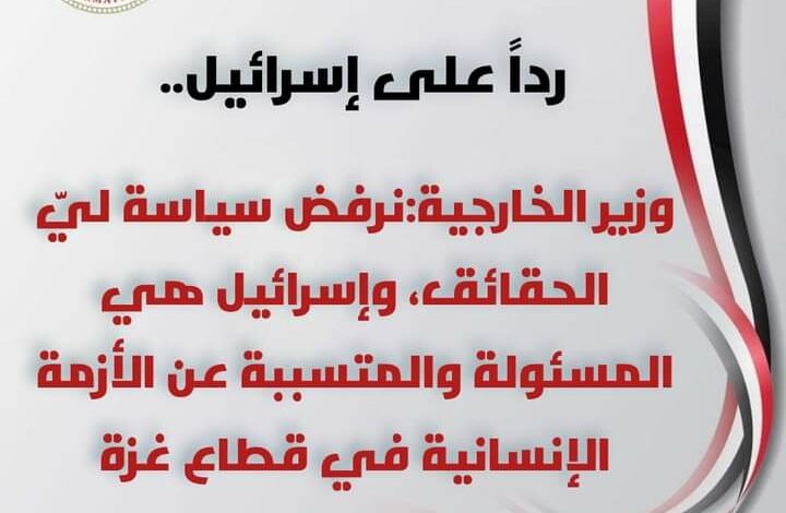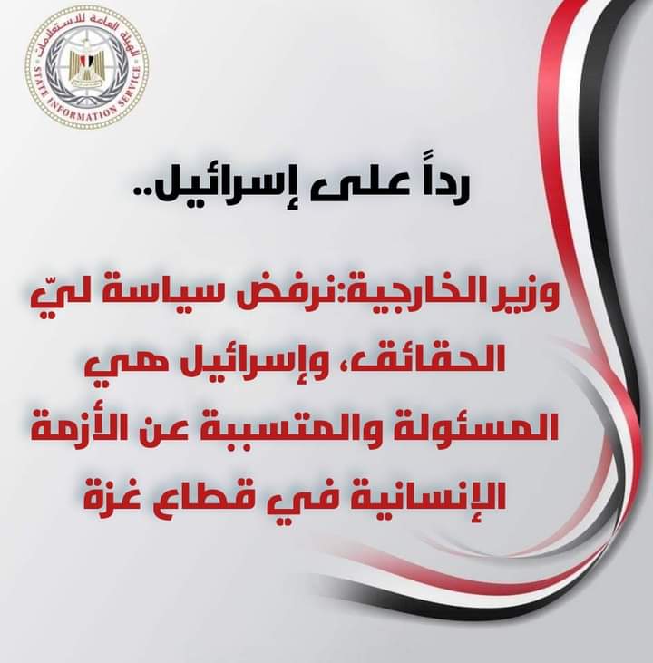 تعقيباً على تصريحات وزير خارجية إسرائيل المطالبة بإعادة فتح معبر رفح وتحميل مصر مسئولية منع وقوع أزمة إنسانية في قطاع غزة، أكد السيد سامح شكري وزير الخارجية رفض مصر القاطع لسياسة ليّ الحقائق والتنصل من المسئولية التي يتبعها الجانب الإسرائيلي، مشدداً على أن إسرائيل هي المسئولة الوحيدة عن الكارثة الإنسانية التي يواجهها الفلسطينيون في قطاع غزة حالياً.