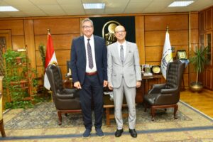 د.المنشاوي خلال استقباله لرئيس جامعة حورس . مستشفيات جامعة أسيوط تخطوا خطوات ملموسة في التطوير والتجديد لتقديم أفضل الخدمات الطبية والعلاجية