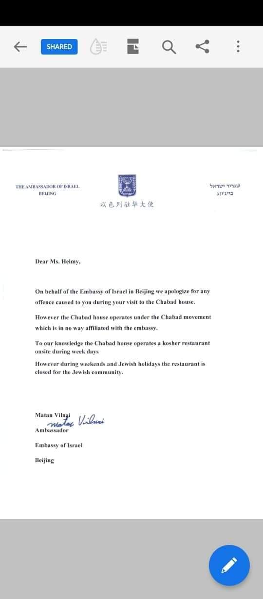 وبناءً عليه، قدمت السفارة الإسرائيلية فى العاصمة الصينية بكين اعتذار رسمي موجه لى أرفقه لسيادتكم للإعتذار عن حادث الإعتداء على