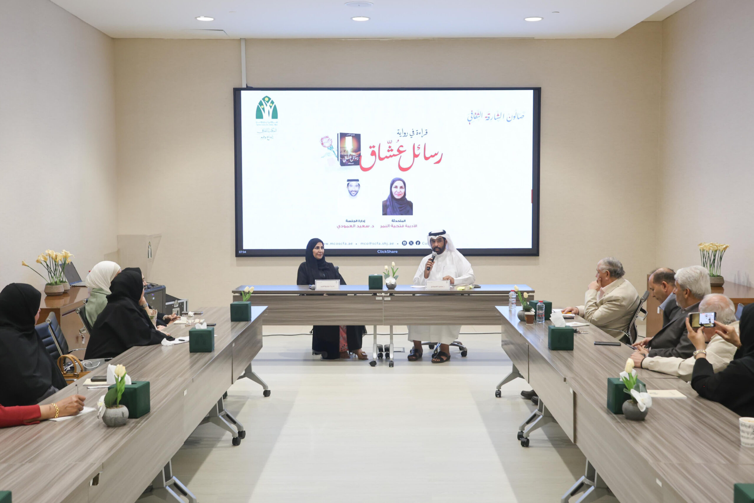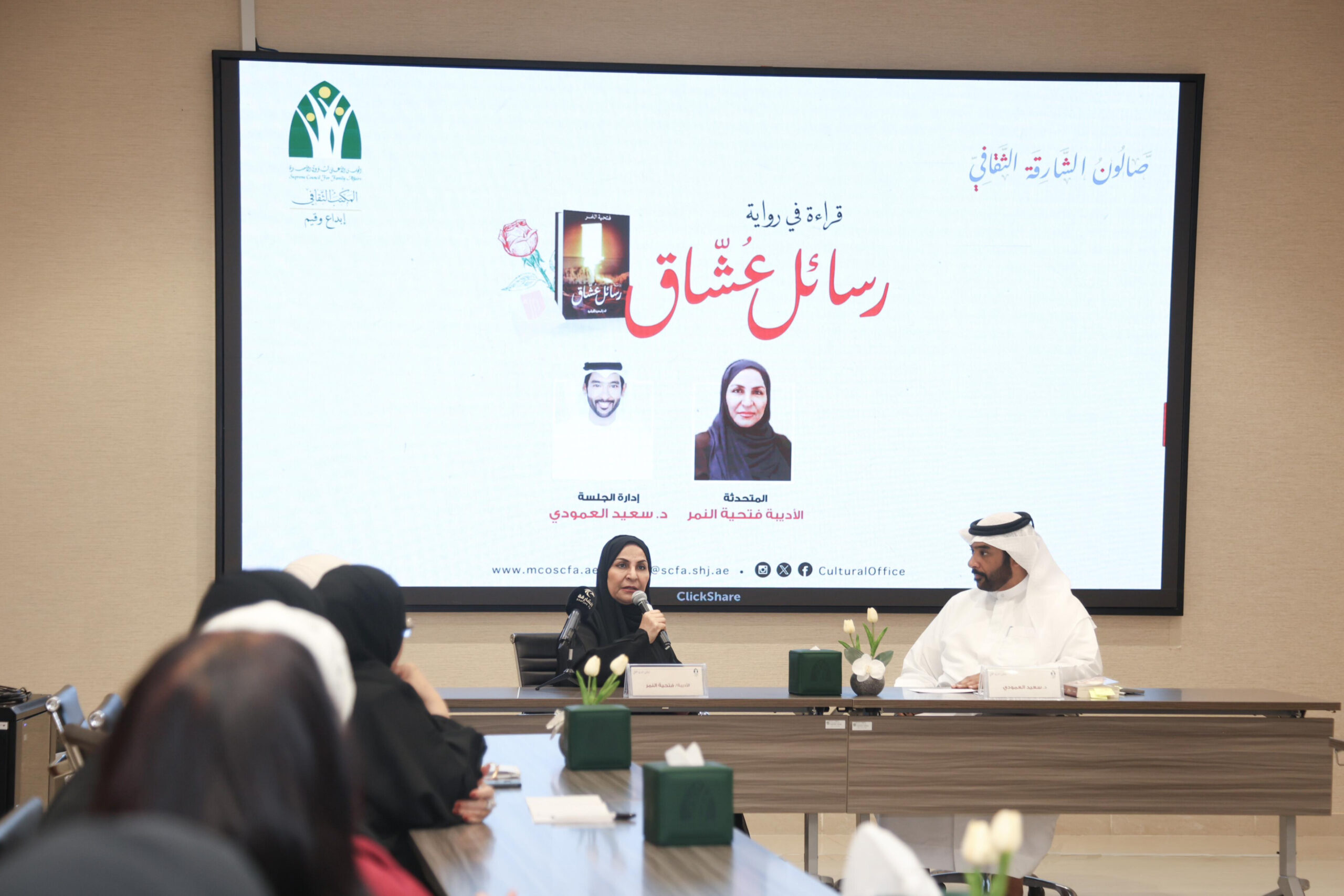 نظم المكتب الثقافي بالمجلس الأعلى لشؤون الأسرة بالشارقة صالون الشارقة الثقافي “قراءة في رواية رسائل عشاق” للأديبة فتحية النمر، وأدار الجلسة د.سعيد العمودي، ضمت الجلسة عدة محاور وناقشت عدة جوانب متعلقة بالرواية، كما سلطت الضوء على ضرورة اهتمام الكاتب الإماراتي بالتراث وبعادات وتقاليد دولة الإمارات.