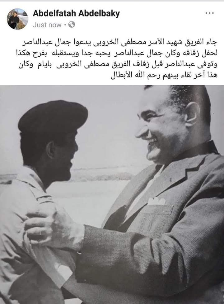 *فاذا بى اكتشف أنه شقيق الفريق مصطفى الخروبى و اسمه على الخروبى مدير معهد النفط ولم يعرف نفسه وكانت المرة الأولى والأخيرة التى رايته فيها وتعجبت جدا جدا جدا لماذا لم يعرف نفسه حتى عرفت الزهد الذى عليه الفريق مصطفى الخروبى
