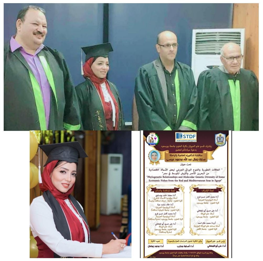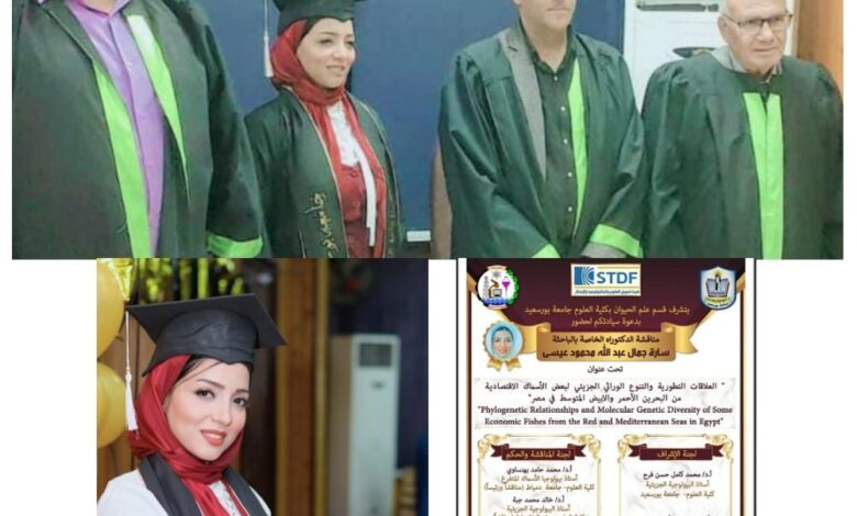 “العلاقات التطوريه و التنوع الوراثي الجزيئي لبعض الاسماك الاقتصاديه في البحرين الاحمر و الابيض المتوسط في مصر” هذا وقد أشادت اللجنة بموضوع الرسالة للدكتورة سارة جمال الباحثة بكلية العلوم وما تم من مناقشة وعرض
