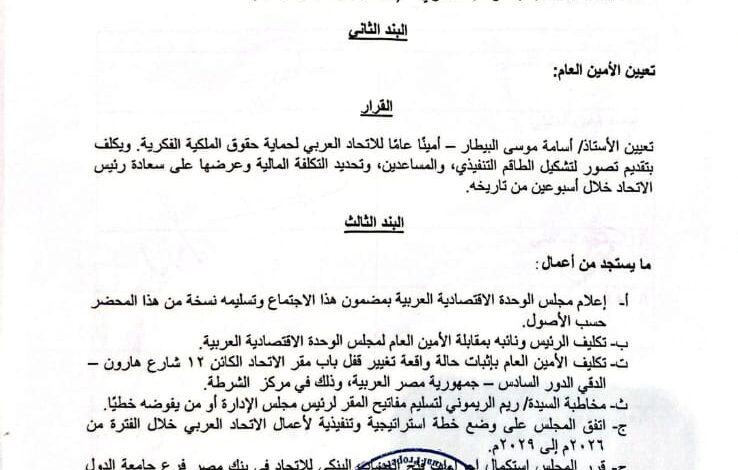 عمومية الإتحاد العربي للملكية الفكرية تطالب أمين عام جامعة الدول العربية بالتدخل لفرض ما يراه مناسبا