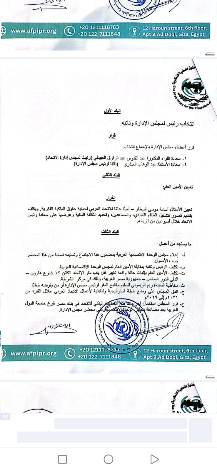 وطالب اعضاء الجمعية العمومية الأمين العام لجامعة الدول العربية بضرورة التدخل بإتخاذ كافة مايلزم تجاه ما تم والتحقيق مع كل من قام بالمخالفة ومساندة كيانات ليست على رغبة الجمعية العمومية.