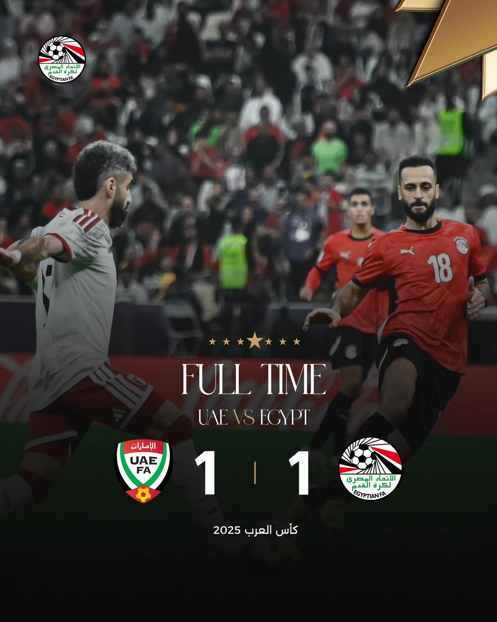 انتهت مباراة الجولة الثانية لمنتخب مصر ببطوله كأس العرب قطر 2025 بالتعادل الإيجابي بين الشقيقين مصر والإمارات بعد مباراه قوية في شوطها الثاني فقط.