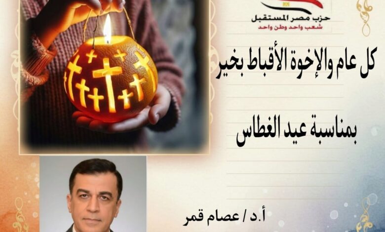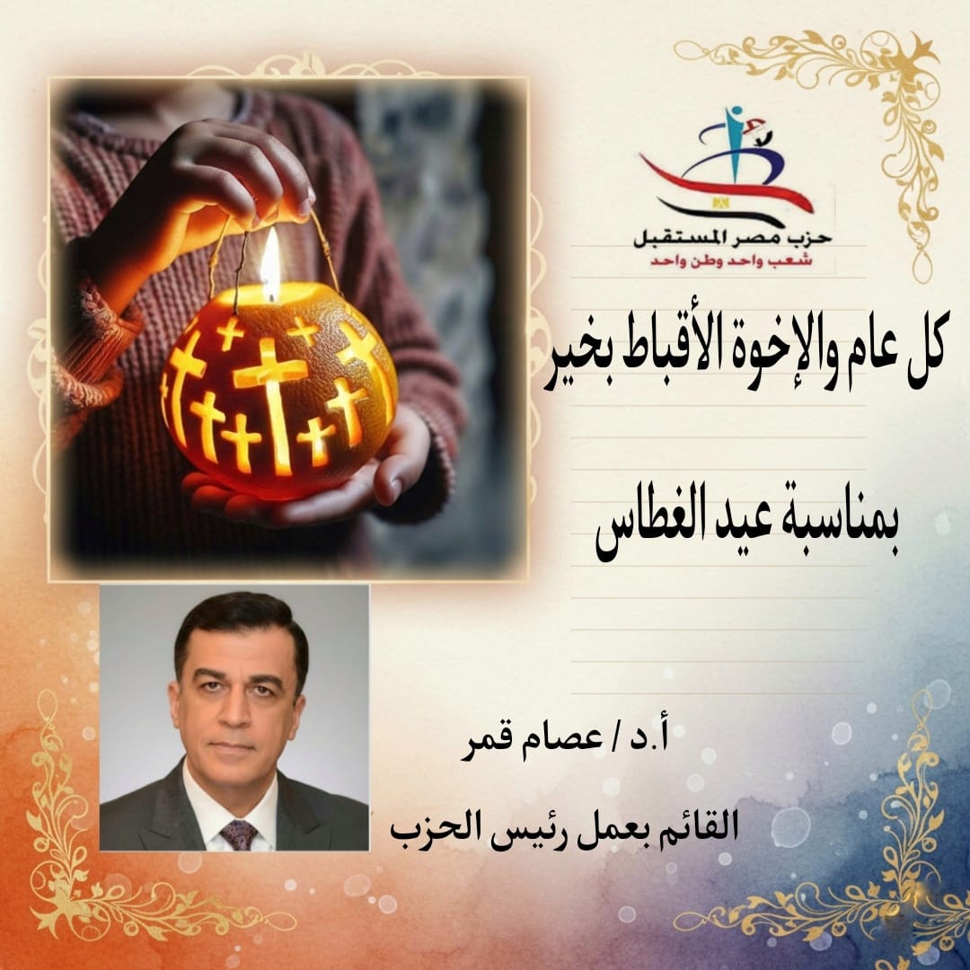 يتقدّم د. عصام قمر، القائم بعمل رئيس حزب مصر المستقبل، بخالص وأطيب التهاني إلى شعب مصر العظيم بمناسبة عيد الغطاس المجيد، هذه المناسبة التي تجسّد أسمى معاني الإخاء والمحبة بين أبناء الوطن الواحد.