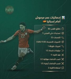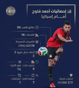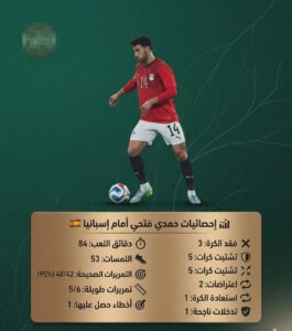حمدي_فتحي نجم خط وسط ودفاع منتخب الساجدين تكسرت على قدمية أغلب هجمات الماتادور الإسباني وكان حائط صد منيع ضد الهجمات الإسبانية المتنوعة ونال طرد متسرع وغير مستحق.