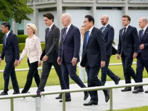 زعماء مجموعة G-7 يسيرون إلى حفل وضع إكليل من الزهور في حديقة هيروشيما التذكارية للسلام في هيروشيما، اليابان. 19 مايو 2023 – Reuters