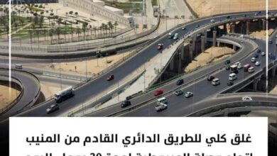 محافظة الجيزة : غلق كلي للطريق الدائري في الاتجاه القادم من المنيب اتجاه وصلة المريوطية والطريق السياحي لرفع الجمالونات والكمرات العرضية لمحور عمرو بن العاص محافظة الجيزة: الغلق لمدة ٣٠ يوماً وتم تجهيز التحويلات المرورية اللازمة لعدم إعاقة الحركة المرورية