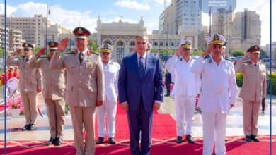 محافظ إسكندرية وقائد المنطقة الشمالية ومدير الأمن يضعون إكليلاً من الزهور علي النصب التذكاري للشهداء بميدان محطة مصر