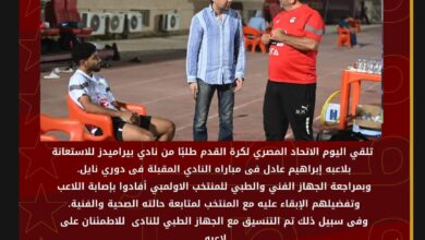 الاتحاد المصري لكرة القدم يتلقي طلبًا من نادي بيراميدز للاستعانة بلاعبه إبراهيم عادل فى مباراه النادي المقبلة فى دوري نايل.