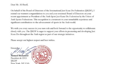 كتب ؛احمد ناصر الجزار صرح الكابتن/ناصر الجزار المستشار الإعلامي للمنطقة العربية والشرق الأوسط بالاتحاد الدولي للجيت كون دو بالولايات المتحدة…