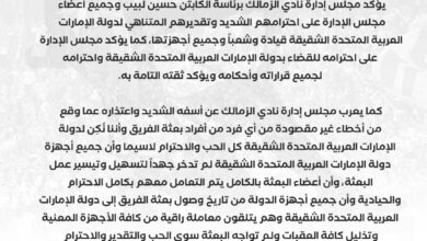 الزمالك يصدر بيانا رسميا يعتذر فيه لدولة الإمارات العربية المتحدة